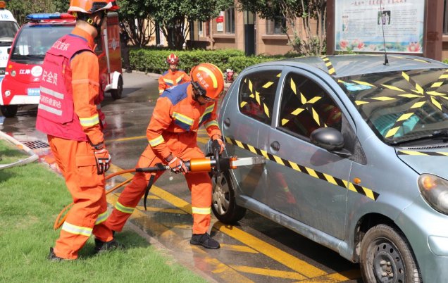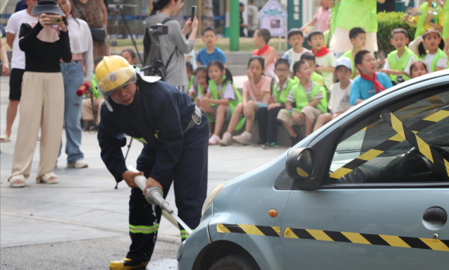 当社区应急救援力量扑灭火情的同时,江岸区消防救援大队百步亭救援站专业消防员和江岸区宝捷应急救援队的社会救援力量及时赶到现场。火情被控制住后,为了安全救出驾驶员,消防员们经过现场研判,决定从道具车辆的副驾驶位置车门处进行破拆操作,发动液压机动泵,连接液压剪扩器,当一名队员用手动撬棍把门撬开一定间隙后,使用液压剪扩器将车门破拆打开,时间仅仅只用了一分钟左右。这时,江岸区宝捷应急救援队的队员们配合消防员对伤员进行院前简单救护处理,然后将伤员转运到救护车上转运去医院,此时现场观摩的“红领巾小小应急宣传员”和家长爆发出热烈的掌声。