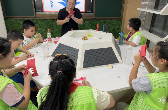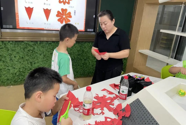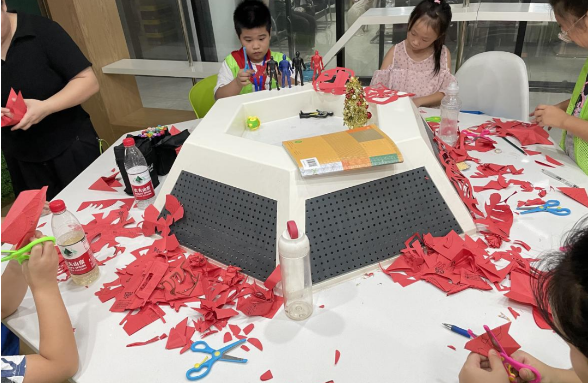 在老师的娓娓道来中,孩子们对剪纸文化产生了浓厚的兴趣,纷纷表示想要亲自操作一番。在孩子们的热切期盼中,志愿者老师将剪刀、彩纸分发给孩子们,并手把手教授大家折叠、裁剪技巧,大家围坐桌边,一边热烈讨论着剪纸的技巧,一边亲手实践,每一剪刀都那么小心翼翼,细致认真。随着剪刀飞舞,五角星、梅花、菊花、灯笼、水母等一幅幅活灵活现的剪纸图案被孩子们的小手成功创作出来,孩子们互相展示自己的作品,收获了满满的成就感。