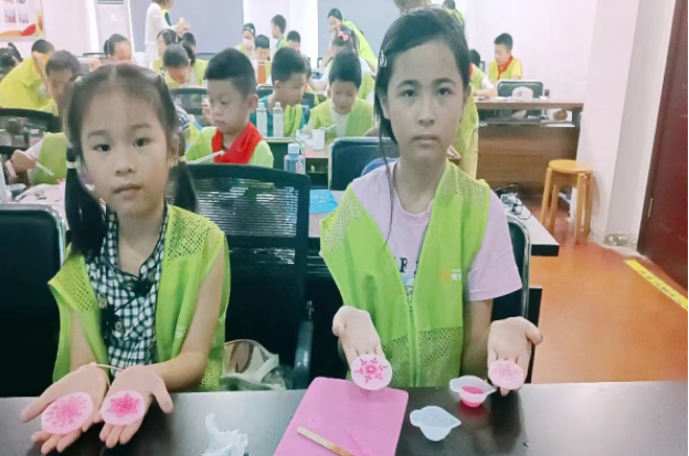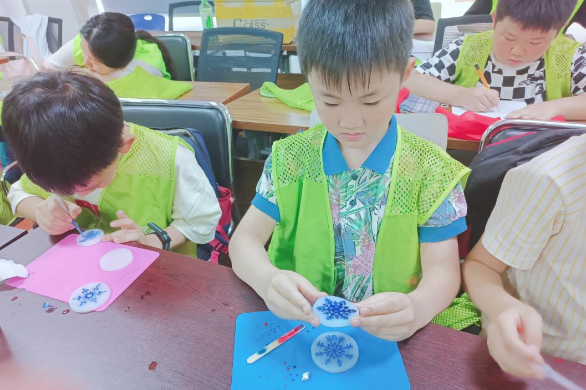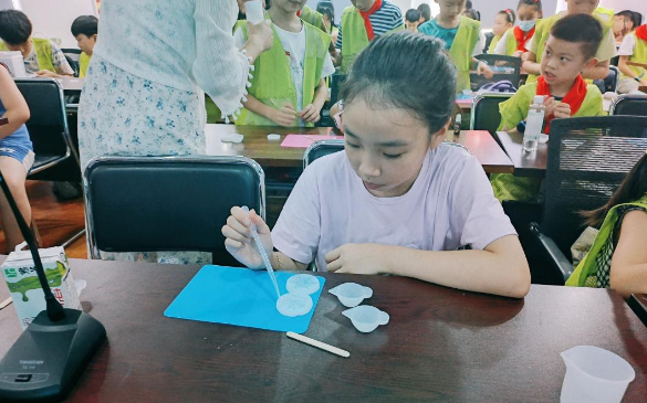 同学们拿到材料包,高兴地手舞足蹈,兴奋地拆开瓶子,把树脂倒进杯子,按照比例,搅拌均匀,旁边同学也开始,你一言我一语的,参考做起来。接着小朋友们选择自己喜欢的色素,做成不同颜色的雪花。经过同学们的精心制作,五颜六色的雪花陆陆续续的出现在同学们们的眼前,有红色,黑色,蓝色,绿色等,深受同学们的喜爱。
