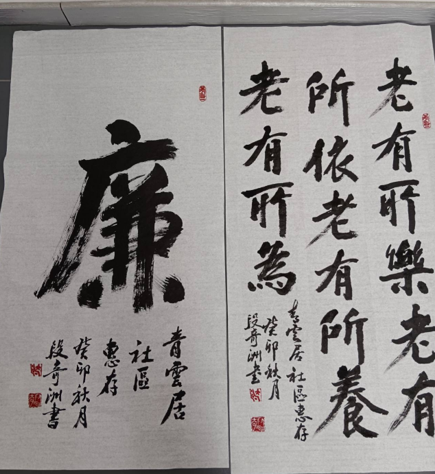 活动期间,在段老师的引导下,大家纷纷拿出自己的看家本领,挥笔泼墨、肆意书写、即兴创作。大家在现场书写了“厚德载物”、“锦绣前程”、“孝敬老人 严教子孙”、“俭以养德”等苍劲有力的书法作品。书法老师段奇洲先生也特意为青云居社区题写“老有所乐、老有所依、老有所养、老有所为”几排大字,表达了对社区开展老年人书法交流活动的支持与认可。