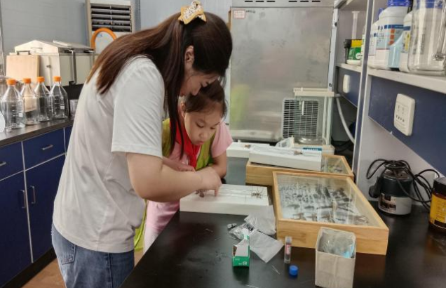 接着,王老师将珍贵的昆虫标本进行展示,讲解昆虫的类型和结构。奇特的昆虫标本吸引了青少年的兴趣,并纷纷感叹,“老师,这是什么昆虫?”张锦钰好奇地问道。老师将标本进行讲解,分发图谱,帮助青少年了解基本结构,随后老师也讲解了金龟子、蝗虫、粉蝶等,多维度学习昆虫知识。最后,老师现场展示昆虫标本的制作方法,引导青少年学习制作工艺,并动手制作蝴蝶标本。