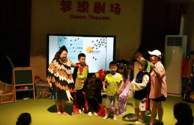 分享完绘本故事后,在四位志愿老师的带领下,孩子们分为4组,开展小组活动、编排小组表演节目。小组节目展示环节,神秘奇特的蜘蛛蟹们表演了蜕壳和集体防御姿态——抱团垒成金字塔;高雅温柔的火烈鸟们再现了其举办宴会的场景,有街舞、芭蕾的舞蹈环节,有动物模仿秀环节,有歌唱环节——唱的是“2022年度儿童经典曲目”《孤勇者》,引发全场所有“群居小动物”们大合唱;活泼有力的帝企鹅们表演了下海捕猎、集体带娃的场景,憨态可掬的步伐,引得大家哈哈笑不停;志愿者狼妈妈带领的6只小狼崽崽压轴登场了,他们自称“七匹狼”,在演绎了集体狩猎场景后,狼妈妈突然发出一声短促嚎叫,6匹狼崽崽集体冲入观众席,成功捕获一只蜘蛛蟹。通过模仿扮演群居小动物这一新颖的活动形式,团结协作,寓教于乐。