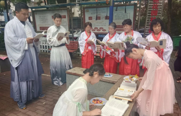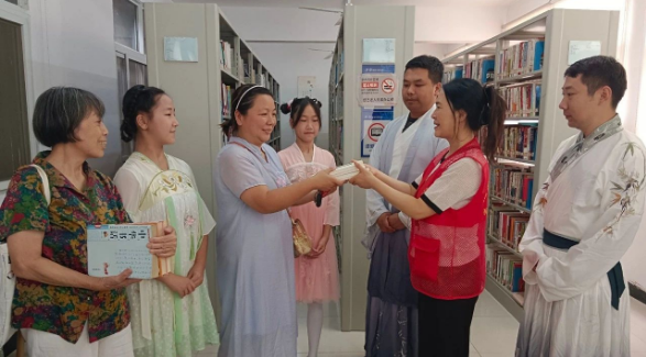 现场,还有不少亲子家庭前来参加本次晒书活动。11岁的刘立恩身着汉服,娴熟地晒书动作引来了居民驻足。汉服搭配传统的晒书节活动,让活动现场古色古香。“我们社区的千家万册图书馆是青山区第一家挂牌图书馆,收藏的书籍涵盖近千户的居民自发捐赠,后期的维护也是由居民进行日常管理,常态化开展读书活动,像刘立恩小朋友就是千家万册图书馆的小小管理员。”碧苑花园社区周琳书记介绍起“千家万册图书馆”的由来,依靠居民力量,共同缔造优质读书氛围。