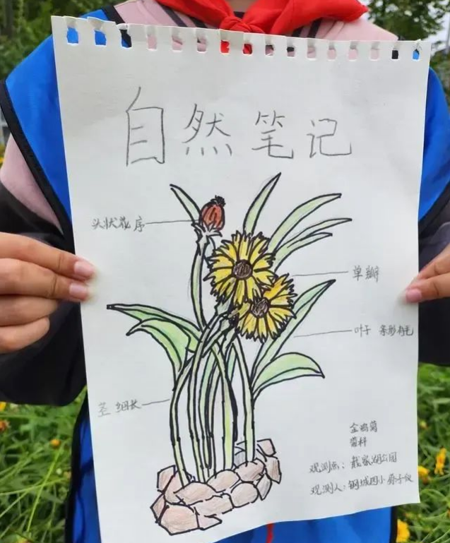 “它的花朵好像光明四射的太阳呀!”聆听着导师的介绍,同学们对金鸡菊有了更深的认识,纷纷拿起纸笔将自己所观所得记录下来,完成了一份属于自己的自然日记。