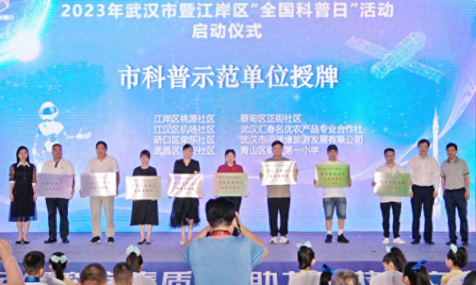 市科技局党组成员、副局长胡军,市妇联党组成员、副主席徐晓娟,市工商联副主席刘冬为荣获2023年武汉市五星级科普示范单位的代表授牌。