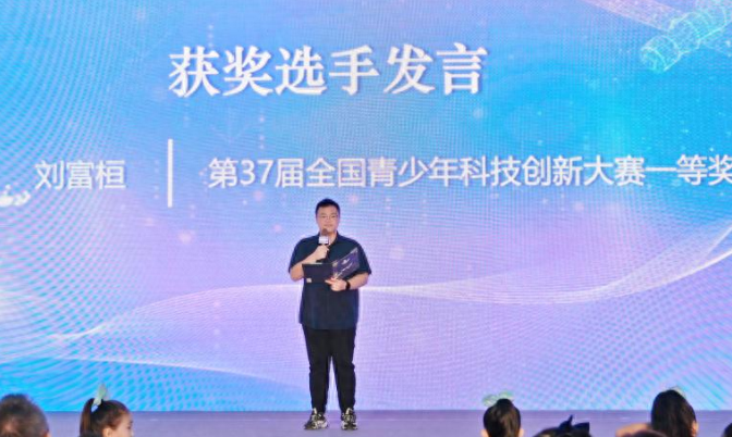 来自武汉外国语学校的刘富桓是第37届全国青少年科技创新大赛湖北省唯一的一等奖获奖者,他现场发表了获奖感言。