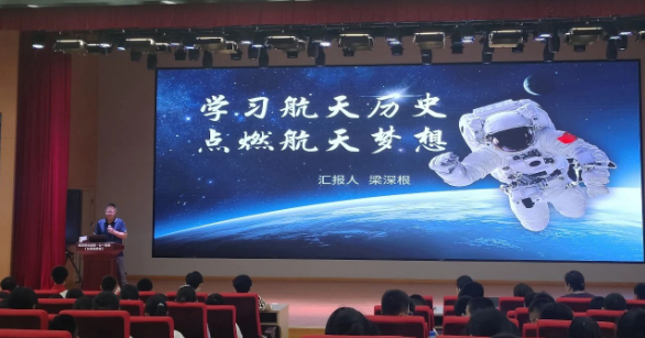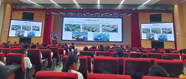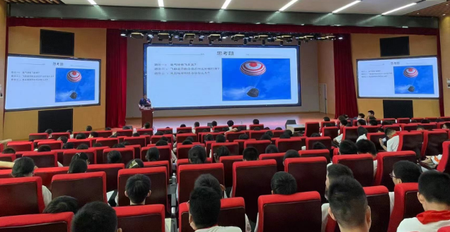 “92年前的今天,震惊中外的九一八事变爆发,硝烟散去,警钟长鸣,让我们铭记历史,缅怀先烈!”梁老师以落后就要挨打,吾辈当自强为切入点,向广大师生们仔细讲解航空与航天的区分、航空器与航天器的区别,航天飞行器的种类等科普知识,逐渐深入到中国航天史。从苦难的中国近代史到当前的国际形势,从航天人的精神使命到中国人应有的精神和担当,从不负重托保家卫国到发奋图强的科技强国梦,引领师生们回忆我国在航空航天科技发展进程中的一个个重要历史时刻、一幕幕艰难险阻、一次次重点突破和重大成就,期间涌现出以中国航天事业之父——钱学森为代表的一代代航天人的荣辱与共、担当使命和家国情怀,以及不舍昼夜、矢志不渝的践行“航天强国、航天报国、航天卫国”的航天精神。