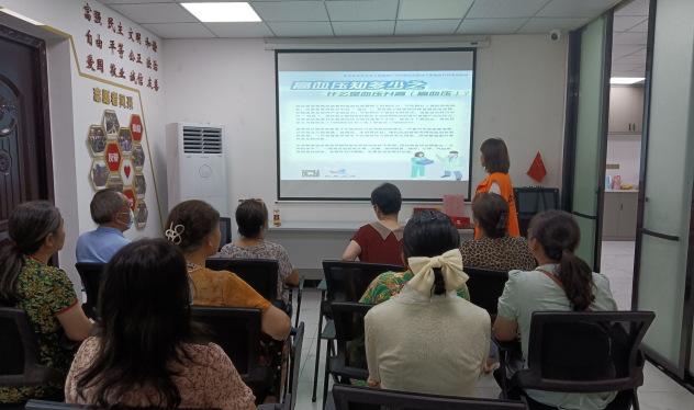 在针对辖区老年居民的高血压科普讲座过程中,社区科普志愿者为向大家科学普及了高血压的相关知识,并告知居民要想预防高血压,就必须做到均衡膳食,三餐均衡,忌饱餐,减少钠盐摄入,补充钙和钾盐。对于喜欢吸烟喝酒的居民,一定要做到彻底戒烟,限量饮酒。