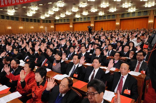 10月21日,中国共产党第十七次全国代表大会在北京人民大会堂胜利闭幕。这是代表们举手表决。新华社记者 李学仁摄