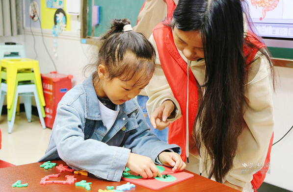 大学生志愿者指导小朋友完成人体消化系统拼图
