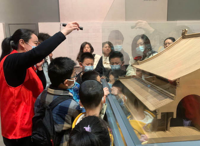 木构造建筑离不开各种刨木工具,展厅里整面木作工具墙吸引了孩子们的目光。石器时代出土的刀、斧、石锯等,均可以用来加工木材,进入金属器大量使用的时代后,随着技术进步以及木材加工需求的复杂化,木作工具也不断发展细化,形成了多种多样的类型。“我在科学课用过这个工具,比它小很多,是锯木头的”,孩子指着墙上的解木工具代表框锯兴奋不已。除此之外,还有用于平木的各种槽铇、用于穿剔的凿和用于测量与定向的工具。经过深入浅出、幽默风趣的科普,孩子们明白了榫卯的制作方式。