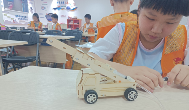 科普知识讲解完成后,大家已经迫不及待的想要开始制作消防云梯车啦,老师先进行了步骤的示范,同学们就紧锣密鼓的开始动手了,制作过程中,年级大一点的同学帮助年级小一点的同学制作,场面是既热闹又有爱。制作完成后大家纷纷向老师展示自己的云梯车。