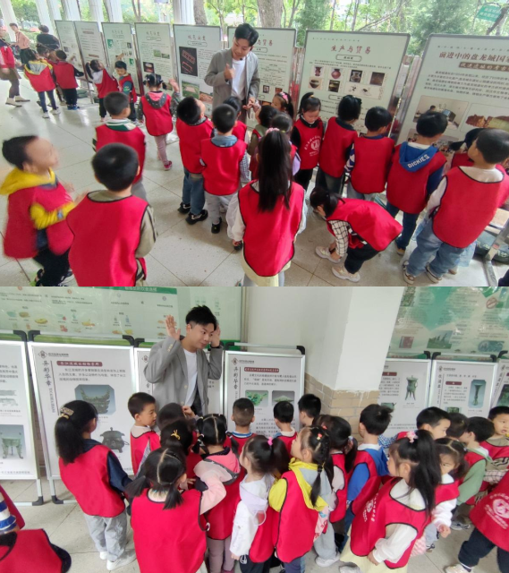 2023年10月13日上午,建国社区携手硚口公园组织娃娃幼儿园的小朋友们在硚口公园科普长廊,观看由在武汉盘龙城遗址博物馆提供的“长江万里青——长江流域青铜器精品图片科普图片展”,通过展示长江流域出土的青铜器精品图片,让孩子们了解长江流域辉煌的青铜文明,它和黄河流域一样同为中华文明的起源。