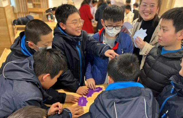 在游戏互动环节,主持人要求同学们分成小组,每组由武大法学院22级法一团支部的团员们担任小组长。组长们给每组发放了提前准备好的法律词语卡片,通过提问和回顾前面环节所学宪法知识的形式,让孩子们以团队合作的方式将相关的法律词语进行配对。大家你一言我一语,现场讨论虽然十分激烈,但每组几乎都能充分发挥团结协作精神,最终圆满完成小组任务。