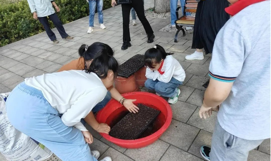 活动最后,江霞带着孩子们一起参与种植金盏菊,孩子们手拿铲子给种植穴填满土,再将种植穴盘放入装好水的大盆里浸泡,直至土壤湿润,接着孩子们轮流把提前浸泡并吹干的种子放入种植穴中并覆土,一颗颗金盏菊就这样被种下了,等待生长。