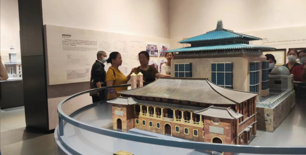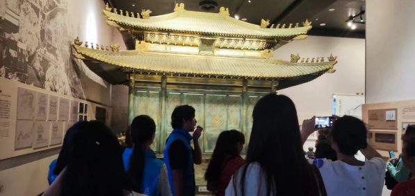 接着,在讲解员的带领下,来到了古代建筑的展厅,这里有来自全国各地的著名古建筑模型,中国古代建筑源远流长,自成一统,本展厅将中国自古以来的土、木成就蹬道溯源,进而以其追求高度、跨度的伟大成就,追求“适形便生”的理性节制为线索展开,解读其材料来源、手工技术、哲匠思维、回归自然、周而复始之历史面貌。正走着“武当山的金顶”就出现在了学员们的面前,这座金顶是设计师按照古代榫卯结构的制造方法采用一定的比例在此建造的,屋顶和装饰都是按照武当山的金顶来复刻的。参观过程中,大家了解到武当山金顶制作的材料和耗费的工序,也是见证了古代人的能工巧匠们的智慧。