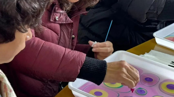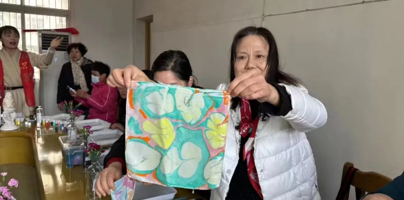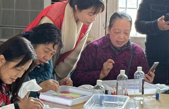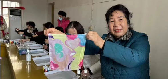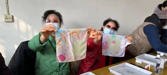 活动的开始,老师先介绍了制作水拓丝巾所需要的工具,并展示了如何使用这些工具完成水拓丝巾。随后,在老师的示范指导下,居民们先蜻蜓点水般向拓盘里滴撒自己喜欢的颜料,使其在画液中自然流淌、变化,形成奇妙绚丽的色彩或不拘一格的纹理。再用小木针在颜料上轻轻拨动勾勒几下,一幅幅漂亮风格各异的图案在水面绽放。接着把丝巾绷紧,轻铺水面,充分利用丝绸的吸附性,待水面上的图案清晰完整地拓印到丝巾上,取出放进固色剂中浸泡几分钟,最后取出晾干,漂亮的水拓丝巾制作便完成了。