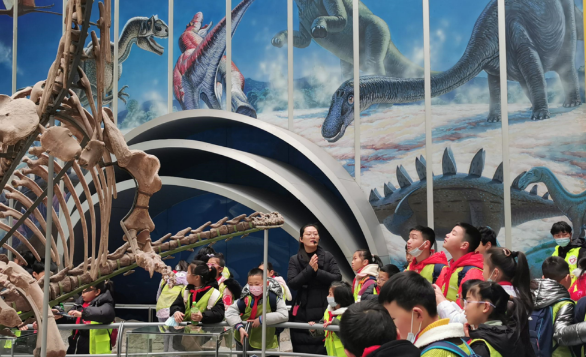 在生命起源与进化展厅,讲解员为少先队员介绍了迎面而来的15.7平方米的海百合化石。这块海百合化石产自贵州关岭,距今2.3亿年,是逸夫博物馆的一大“镇馆之宝”。“队员猜猜海百合是动物还是植物呢?”在老师和导游的引导下,队员们踏上了智慧之路,开启了科学之旅。随后,讲解员介绍了地质年代表,展示了马门溪龙、黄果树安顺龙、梁氏关岭鱼龙等化石,介绍了生物大灭绝事件。“哇,这是真的恐龙化石吗?”栩栩如生的恐龙化石吸引孩子们驻足讨论。在讲解老师的带领下,大家一边学习科学知识,一边身临其境地感受,一边聆听生动有趣的地球变迁背后的秘密,完全沉浸在老师描述的地球长河和远古生物世界里!