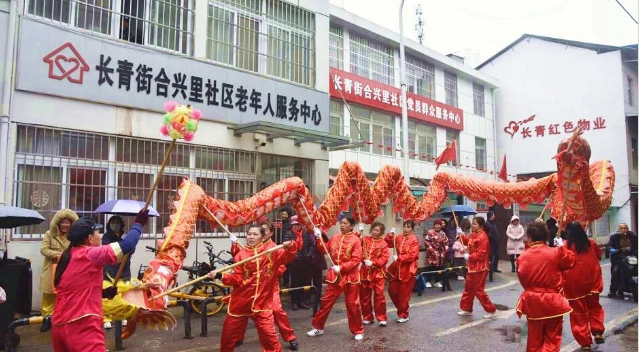与此同时,合兴里社区也处处洋溢着喜庆祥和的节日氛围。室外,一条长达十余米的红色巨龙在舞龙队员们的精湛技艺下翩翩起舞,时而翻腾跳跃,时而盘旋游走,引来居民阵阵喝彩。