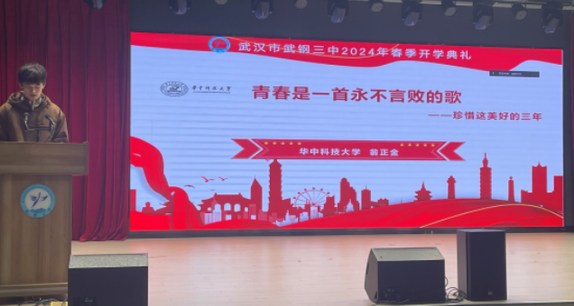 武钢三中举行了主题为“以梦为马,不负青春”的开学典礼。典礼上邀请了武钢三中毕业生代表翁正金做了题为《青春是一首永不言败的歌》的演讲,他以自己的求学经历鼓励学弟学妹,号召全体同学要勇于面对机遇和挑战,树立远大的理想和目标,找准合适的方法与策略,脚踏实地努力,书写自己辉煌的人生。