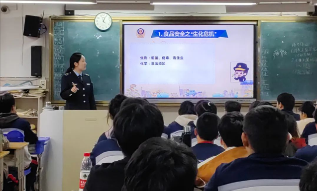 在第29个全国中小学生安全教育日来临之际,为扎实推进辖区青少年安全教育工作,近日,武汉市青山区冶金街道悦达社区联合市场监督管理局开展“共同关注食品安全 携手缔造健康生活”科普进校园主题宣讲活动。走进钢城十六中校园课堂,向青年学子宣讲校园食品安全知识,引导学生勤俭节约,营养膳食,抵制高盐高糖高脂等“垃圾食品”,树立食品卫生安全观念,提高食品安全自我防范能力,预防和减少食源性疾病的发生。