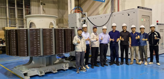 (中心在全球首创的大型电机“无磁装配—整体充退磁技术”在20兆瓦级永磁风力发电机上实验成功。)