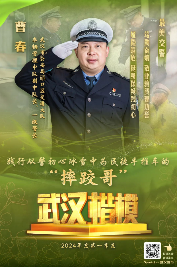 曹春,男,1981年12月出生,中共党员,现任武汉市公安局硚口区交通大队车辆管理中队副中队长、一级警长。