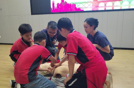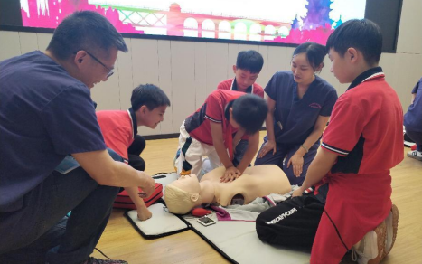 为达到更好的实操效果,学习现场设置了2组人体模型,青少年争先恐后上台现场进行海姆立克、心肺复苏紧急救治演练,让理论化的动作要领变得更加通俗易懂。看到学生的演练,韦主任忍不住称赞:“虽然是第一次尝试,但是动作很规范。”