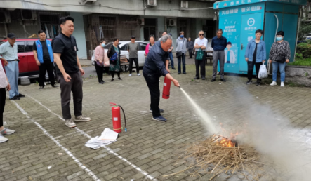 在理论学习后,众人来到四美苑小区小广场进行实地演练。参加人员认真学习,了解灭火器“一提、二拔、三握、四压”的正确使用步骤,并通过对火堆进行灭火实践,掌握灭火器的使用方法与技巧。