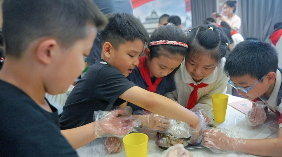 紧接着,活动进入了“我的课堂我做主:化身珍珠小超人”的动手实践环节。在这个环节中,学生们在老师的指导下,亲自开河蚌、取珍珠、清洗珍珠,并尝试制作珍珠手串。他们不仅学到了理论知识,更在实践中体验到了科学的魅力。