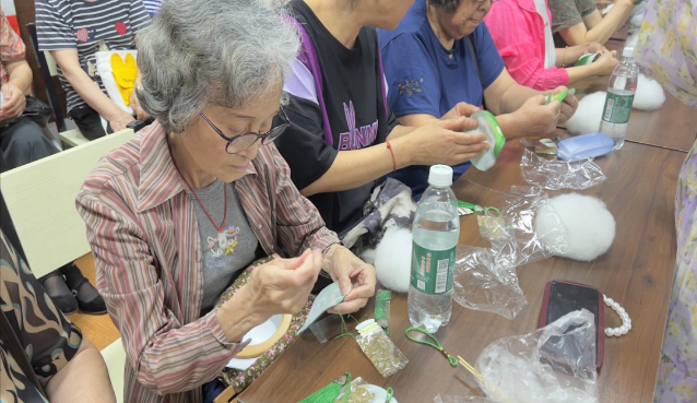 活动开始,社工为居民们向大家介绍了端午节的习俗,带上寓意吉祥、祈福的五彩绳,一同分享着幸福快乐的节日氛围。接着,社工带领居民共同制作“廉洁”香囊。居民们热情高涨,相互指导帮助,大家穿针引线、精心缝合,一个个精致的香囊在大家的巧手下逐渐成形, 香囊清幽的香气不仅提神驱蚊,同时寓意着祛除污秽、提升正气,成功地将廉洁元素与香包结合起来,时刻提醒大家清正廉洁、自律做表率。