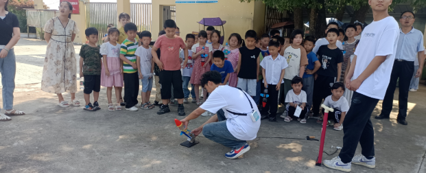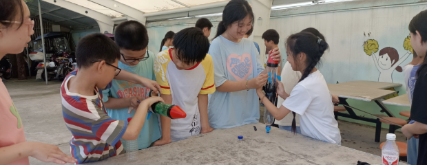 在操场上,由钱学森纪念馆志愿者指导小学生们如何利用矿泉水瓶、胶带等简单的材料,制作小火箭,在制作前志愿者作了示范,讲解了制作技巧要领和注意事项,学生们看得津津有味,小学生配合默契,认真动手做,不一会儿,眼前呈现出一个个小火箭模型,通过这种做游戏的方式让他们了解学习航天科技知识,激发青少年热爱科学、学好科学的兴趣。