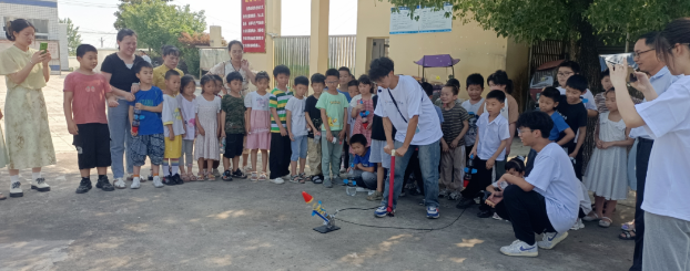 (志愿者展示小火箭模型)