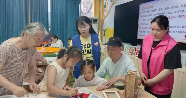 紧接着,志愿者详细讲解了拓印的操作流程和注意事项。他们准备了专业的刻刀、宣纸、雕刻版等材料,并现场示范了拓印的步骤。家长和孩子们在科技志愿者指导下,纷纷动手实践,亲手体验了这一传统技艺。