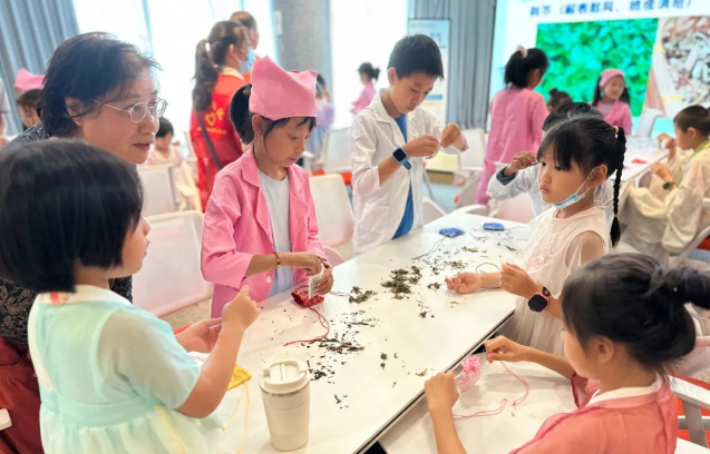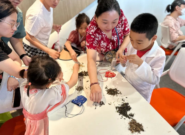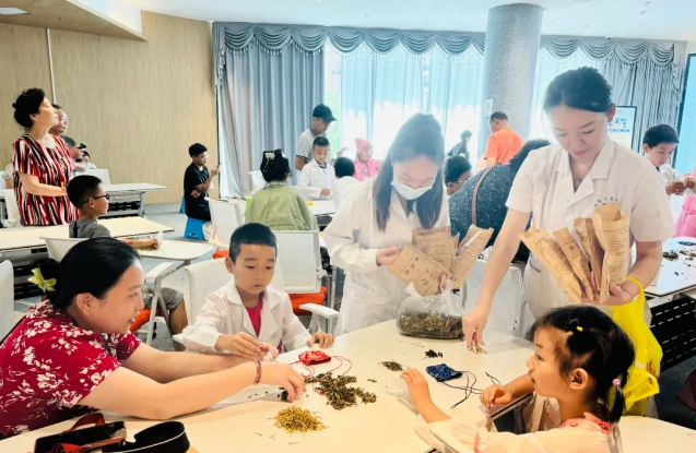 随后,医师带领孩子们认识了生活中一系列常见中药,让孩子们对中药有了更加直观的认识,近距离了解到中医药文化的博大精深。此外,活动还特别设置了“认穴位”环节,通过歌曲、问答等方式,让孩子们在轻松愉快的氛围中学习人体穴位知识并学做养生操,感受中医养生的独特魅力。最令人期待的莫过于制作中药香包的环节了。小朋友们挑选自己喜欢的中药材,金银花、丁香、佩兰、木香……然后,将药材按照一定比例混合在一起,他们小心翼翼地将混合好的中药材放入多彩的小布袋中。不一会儿,一个个散发着淡淡香气的中药香包便诞生了。“爸爸,帮我把香包挂在脖子上!”小朋友们戴着自己亲手制作的香包,脸上洋溢着满满的成就感和自豪感,纷纷拍照留念。
