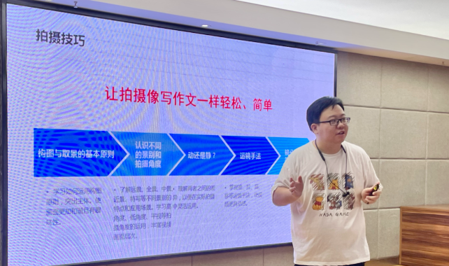 活动现场,武汉多米文化科技有限公司摄影技术总监王彦文倾囊相授,将他的专业知识和经验转化为通俗易懂的课程内容,让每一位参与者都能轻松掌握短视频拍摄的基本技巧。课程中,王老师向居民们介绍了短视频的基本概念和发展趋势,强调了短视频在现代社交和生活中的重要性,详细讲解了拍摄短视频时构图与取景的基本原则、不同景别与拍摄角度、运镜手法等,并现场演示如何使用手机或简易设备拍摄出高质量的短视频。