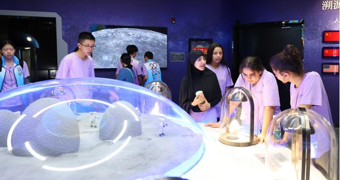 “这和登上过月球的国旗一样!”在武汉科学技术馆“月球空间”展区,讲解员向青少年代表团介绍,这面国旗是嫦娥五号任务月面国旗的同款。“这是武汉纺织大学徐卫林院士赠送给我馆的珍贵展品,和登月国旗使用同样的技术手段制作,科技感满满。”工作人员展开介绍,嫦娥五号任务月面国旗由徐卫林院士团队历时八年、持续攻关完成,是中国航天史上第一面在无温控保护的严酷环境条件下,成功在月球上自主展开的织物版国旗。