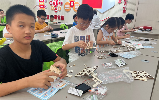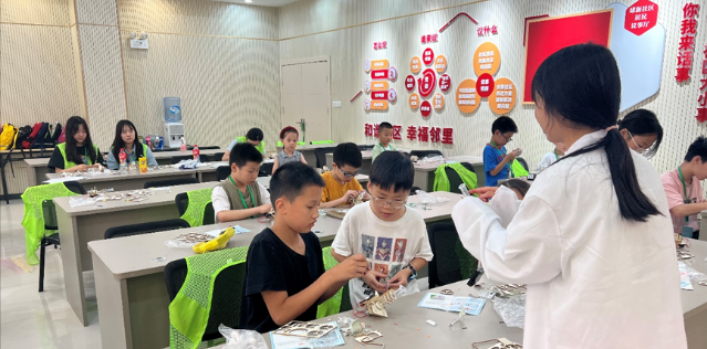 在讲解完原理后,汪老师和小助手们发放了空气炮模型,孩子们在老师的指导下一步步进行模型组装。现场气氛热烈,孩子们积极探讨遇到的问题,小助手们对操作有困难的小朋友进行了悉心指导。组装过程中,孩子们不仅学习了空气动力学和机械原理,还体验了团队合作的乐趣。