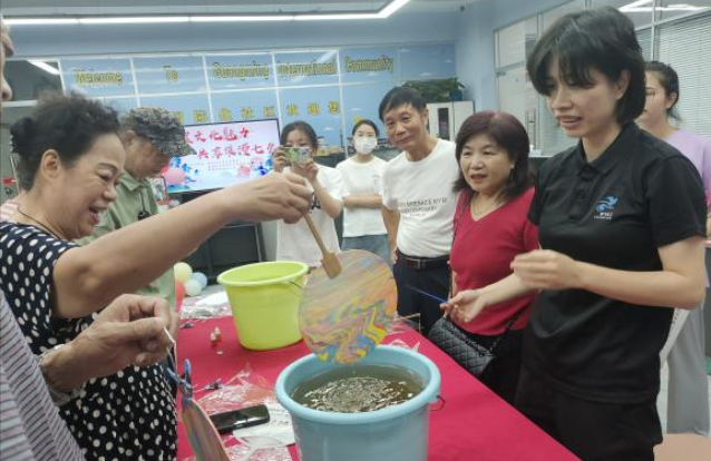 随后,活动巧妙融入传统文化元素,引领金婚夫妇及居民们走进漆扇艺术的奇妙世界。通过社区科技志愿者的生动讲解与示范,大家不仅了解了漆扇的悠久历史,还亲手体验了漆扇制作的乐趣。在色彩与水的舞蹈中,一幅幅独一无二的漆扇作品应运而生,不仅展现了居民们的创造力与审美情趣,更让传统文化在指尖绽放新光彩。
