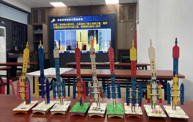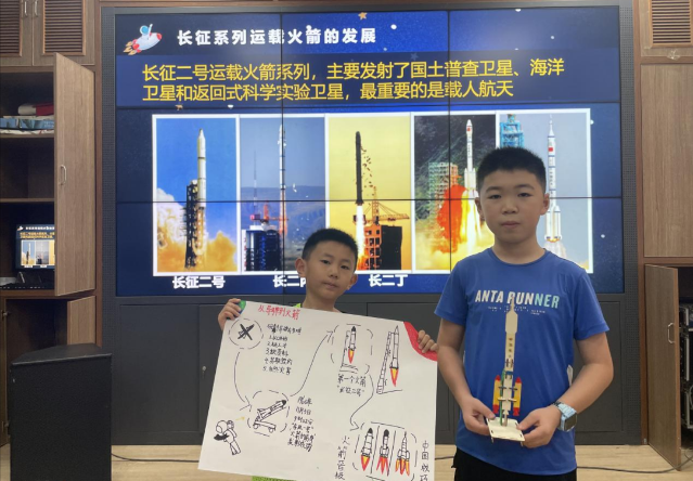 孩子们围坐在长桌旁,认真地开始了创作。有的孩子在纸上画出了长征一号发射东方红一号卫星的场景;有的孩子则用彩色笔勾勒出长征五号的巨大轮廓,旁边配上了发射重型卫星的说明文字。老师穿梭在孩子们之间,时而指点一二,时而给予鼓励。
