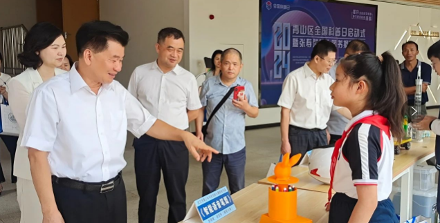 最后,党组书记、副主席李定君,武汉化工区管委会副主任刘晶晶,武钢集团党委副书记、纪委书记周刚,区科协党组书记彭红,区委宣传部二级调研员付光耀,区教育局党委委员、副局长陈锋共同登台。刘晶晶副主任宣布“2024年青山区全国科普日活动”正式启动,六位领导同步按下启动装置的手掌印记,标志着2024年青山区全国科普日活动盛大启幕。启动式结束后,市、区领导和嘉宾在工作人员的引导下,参观了张寿荣院士图书展陈馆及校园科普墙区域。步入展区,一排排红色的院士题字跃然眼前,它们如同灯塔,照亮了青少年前行的道路。“让科学家思维和创新精神成为每一个孩子的成长基因-姜德生”、“寻找最美‘小青科’- 李建成”……这些题词不仅是对青山区科普工作的肯定,更是对青少年寄予的厚望与期待。展陈馆内复原了张寿荣院士生前办公室,展示了张寿荣院士的手稿、院士建议、院士题词以及工作日志等珍贵物品。在科普墙的另一侧,来自武钢三中《病毒防护帽》、武汉市第49初级中学《电动自行车智能安全管理系统》、工业科技学校《无碳小车》、红钢城小学《自行式吊车气压演示仪》、钢花小学《智能语音笔筒》等发明作品和展架成为了另一道亮丽的风景线。这些作品和展架不仅展示了学生们在科技创新方面的才华与实力,更体现了青山区在青少年科创教育方面的丰硕成果。近年来,青山区教育局紧跟国家创新驱动发展战略步伐,将科创教育视为提升学生综合素养的关键途径,精心策划并执行了涵盖科技创新、头脑奥林匹克、信息学奥林匹克等十六大项科技活动,全面覆盖普及、竞技、创新、教育四大维度。活动形式从单一竞赛扩展到课程体系构建、教学研究、课题探索及综合性实践活动,形成了全方位、深层次的科创教育体系。在此框架下,近两年青山区青少年在全国科创竞赛中屡创佳绩,累计获奖超66项,充分彰显了区域科创教育的强劲实力与辉煌成就。