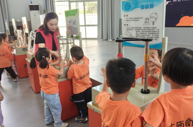 在老师的带领下,大班和中班的小朋友们依次有序进场参观并体验各个科技项目,科技志愿者耐心地为孩子们讲解展品的原理,用简单易懂的语言引导孩子们感受科学的魅力。孩子们聚拢在科普展品周围,兴致勃勃地动手操作各类科普展品。转动齿轮,亲身感受机械的强大力量;按下按钮,仔细观察电路的奇妙变化。神奇的光学仪器为孩子们开启了别样的世界,他们满是好奇地围在一起热烈讨论,小脸上绽放着对科学的深切浓厚兴趣以及强烈的探索欲望。