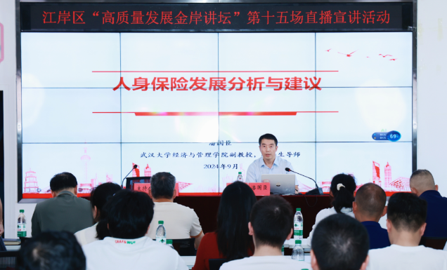 武汉大学经济与管理学院保险与精算系副教授、硕士生导师、湖北省保险学会理事潘国臣教授受邀担任主讲嘉宾。潘国臣以其深厚的学术背景和丰富的实践经验,从人身险基本概念、保险业发展现状及存在问题、人身险业发展环境分析、江岸区人身险市场高质量发展策略等四个方面对人身保险发展进行了分析,并提出了实际建议。他指出,随着人口老龄化进程的加速和居民收入水平的提高,我国人身险市场正面临前所未有的发展机遇和挑战。他强调,保险机构应紧跟市场变化,加强产品创新和服务升级,以满足消费者日益多样化的需求。同时,呼吁政府部门应进一步完善相关政策法规体系,为保险市场的健康发展提供有力保障。